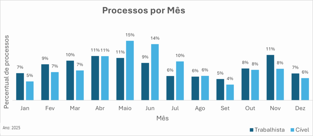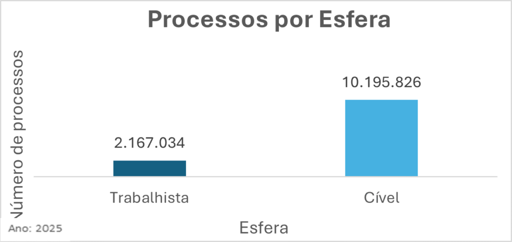 Até maio de 2025, foram distribuídos cerca de 3.802.010 milhões de processos cíveis e 902.058 milhões processos trabalhistas. Isso significa que os processos cíveis representam cerca de 80,82% do total analisando, enquanto os trabalhistas correspondem a 19,18%:
