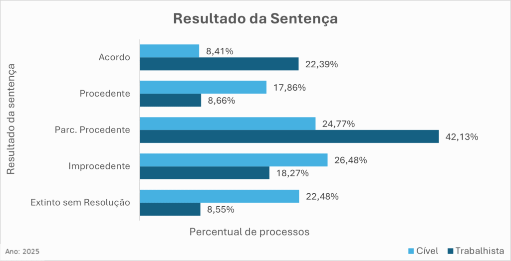 Até maio de 2025, o percentual de processos que resultaram em acordo no âmbito cível foi de 3,51% (133.591 mil processos) e no âmbito trabalhista for de 4,11% (37.070 mil processos).
